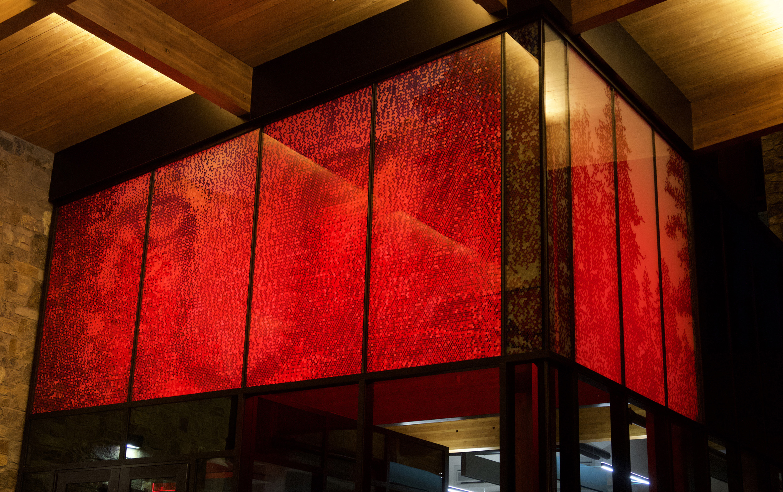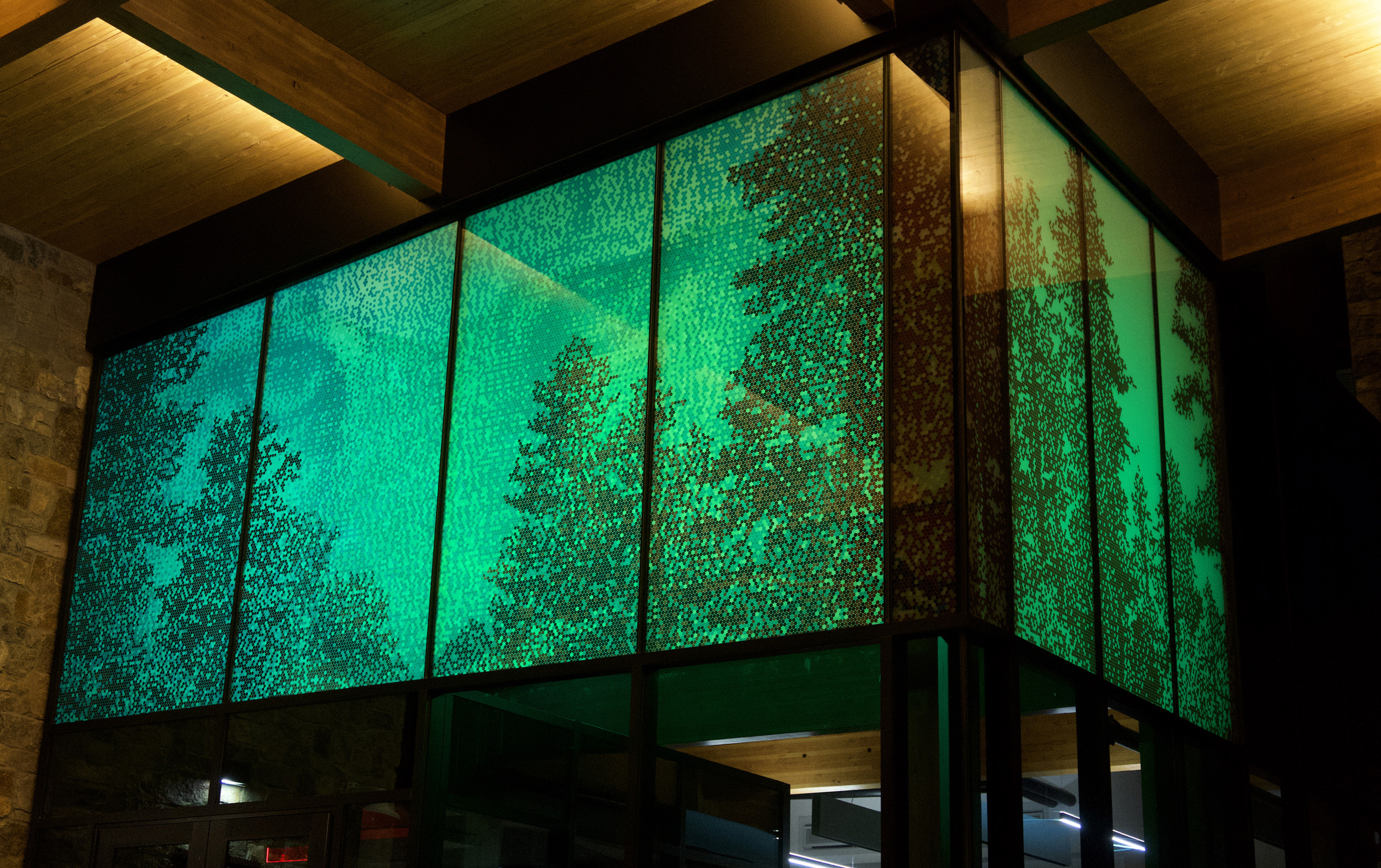 “Lion Eyes (Through the Forest),” designed by Haddad|Drugan, is an illuminated glass installation above the main entry vestibule depicting Flagstaff’s natural beauty.
